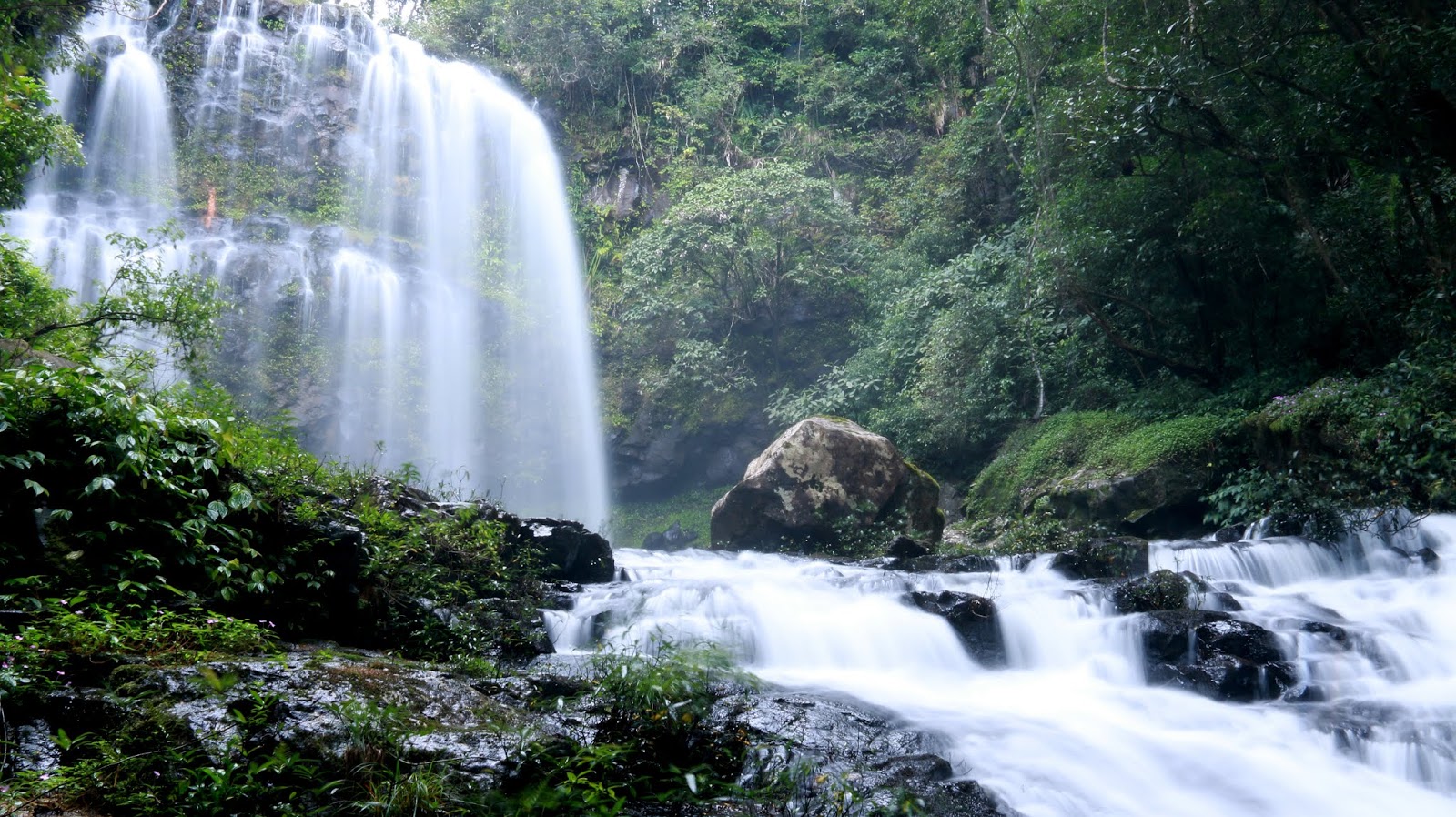 Tôi ngồi trên mỏm đá đầu thác, dõi mắt nhìn về dòng suối uốn khúc dưới thung lũng xa xa, xung quanh là rừng cây xanh um bao bọc tạo thành hình mái vòm.