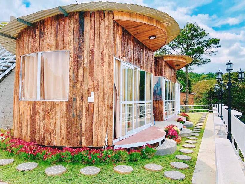 Các căn phòng ở đây đều được làm từ chất liệu chủ đạo là gỗ thông, bao quanh là không gian xanh ngát của những đồi thông và vườn cây ăn trái.