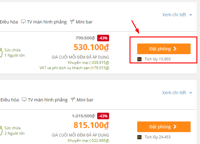 Bước 1. Chọn điểm đến, thời gian và phòng khách sạn ưng ý trên Vntrip.vn, sau đó bấm Đặt phòng.