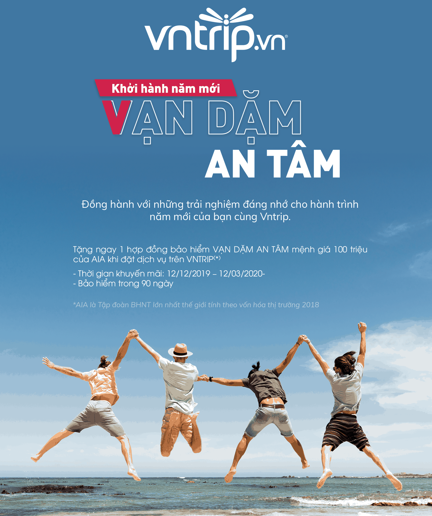Để chia sẻ mối lo và giúp bạn có một mùa xuân trọn vẹn và an tâm hơn trong những chuyến đi, VNTRIP phối hợp cùng tập đoàn bảo hiểm nhân thọ toàn cầu AIA (Việt Nam) cung cấp chương trình “KHỞI HÀNH NĂM MỚI – VẠN DẶM AN TÂM” dành tặng ưu đãi gói bảo hiểm Vạn Dặm An Tâm siêu ưu đãi giá trị lên đến 100.000.000 VND.