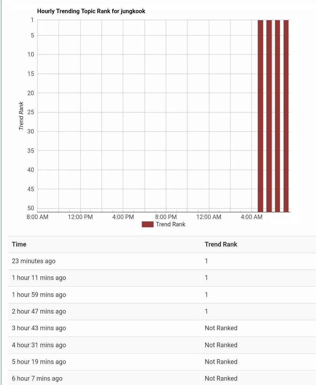 Chỉ sau 1 tiếng, từ khóa “jungkook” dẫn đầu xu hướng tìm kiếm thế giới, “jeon jungkook” cũng được trend vị trí top 4 tìm kiếm thế giới. Jungkook lọt top trend và đạt #1 tại 42 quốc gia và vùng lãnh thổ. Và cũng trong vòng chưa đầy 12 tiếng (chỉ 8 tiếng 23 phút), tweet ảnh selfie của Jungkook đã vượt 2 triệu lượt thích. Thành tích này lại lần nữa giúp cho Jungkook trở thành nghệ sĩ KPOP sở hữu tweet đạt 2 triệu likes nhanh nhất Twitter.