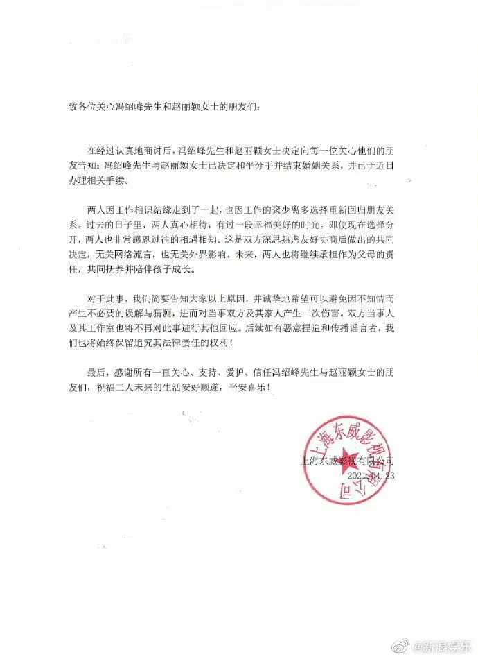 Bẵng đi một thời gian, cứ ngỡ rằng cuộc sống hôn nhân của 2 người rất tốt đẹp, trong khi rất nhiều cặp vợ chồng khác đã mỗi người một ngả, chóng vánh như chưa từng có cuộc hôn nhân, phải kể đến như Dương Mịch ly hôn Lưu Khải Uy. Đùng một cái, sáng sớm ngày 23/04/2021, phòng làm việc của cả Triệu Lệ Dĩnh và Phùng Thiệu Phong cùng đồng loạt đăng văn bản công bố chính thức, xác nhận hai người họ đã ly hôn, kết thúc quá trình hôn nhân kéo dài ba năm từ 2018 đến 2021, khiến cho các fans hâm mộ shock không nói thành lời.