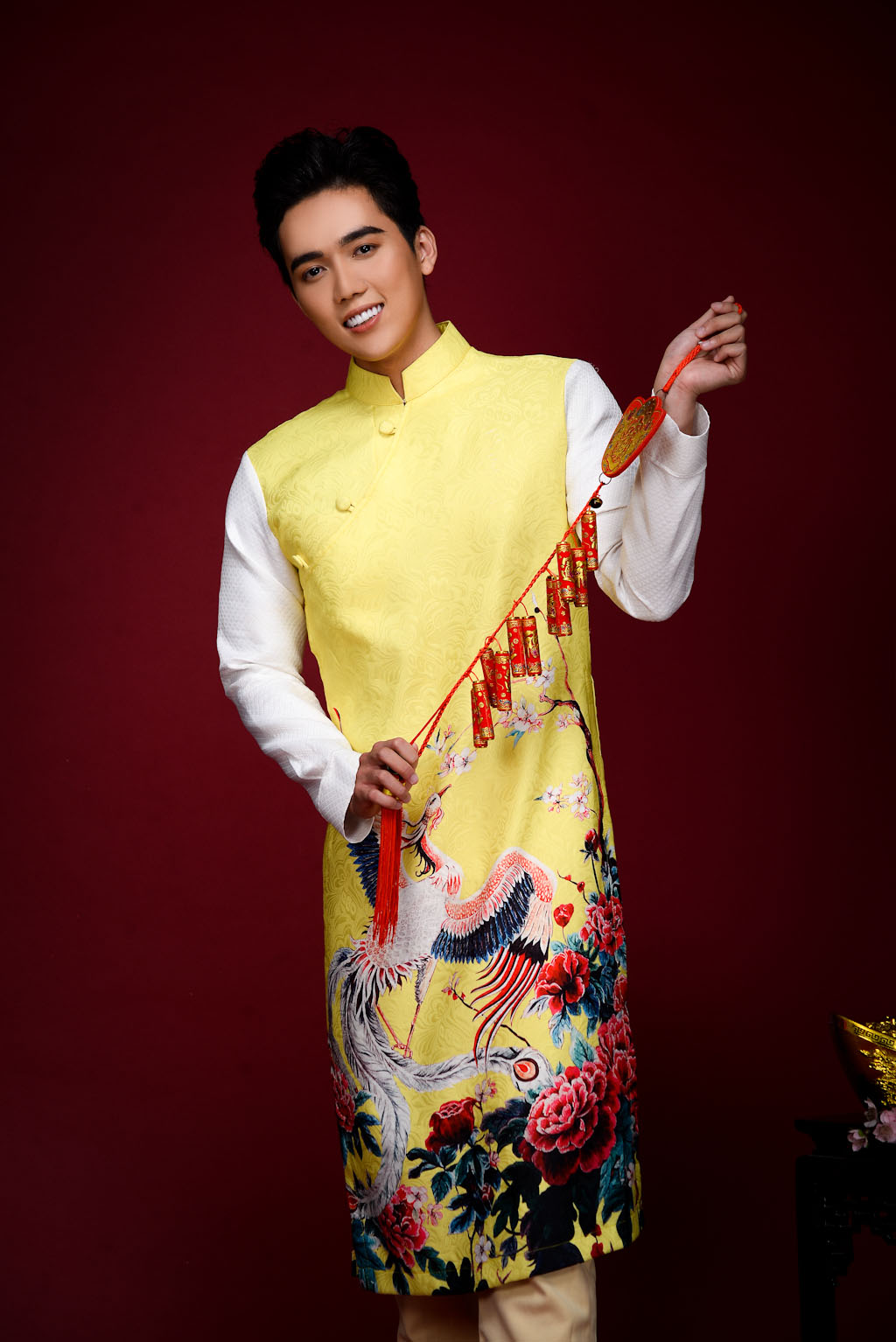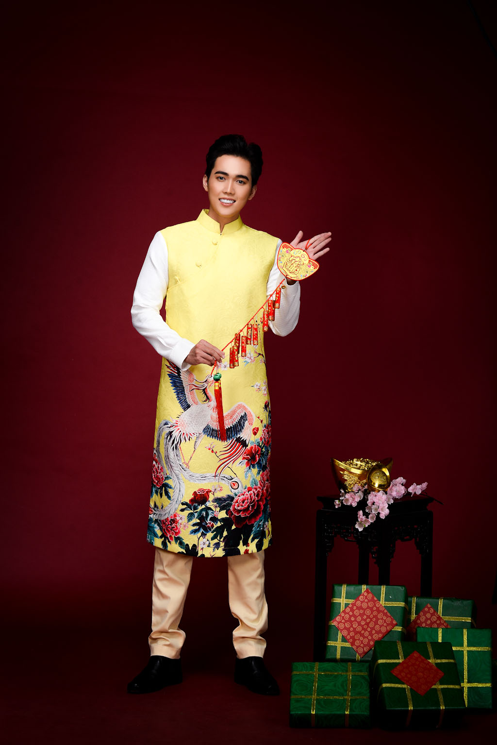 Cặp đôi nam thanh nữ tú Phi Văn – Trendy Ngân có gương mặt sáng và ngoại hinh ưa nhìn sẽ là điểm cộng trên con đường hoạt động nghệ thuật. Cả hai sáng bừng trong thiết kế Áo dài gấm in hình phượng hoàng thanh thoát trên nền vàng rực rỡ.