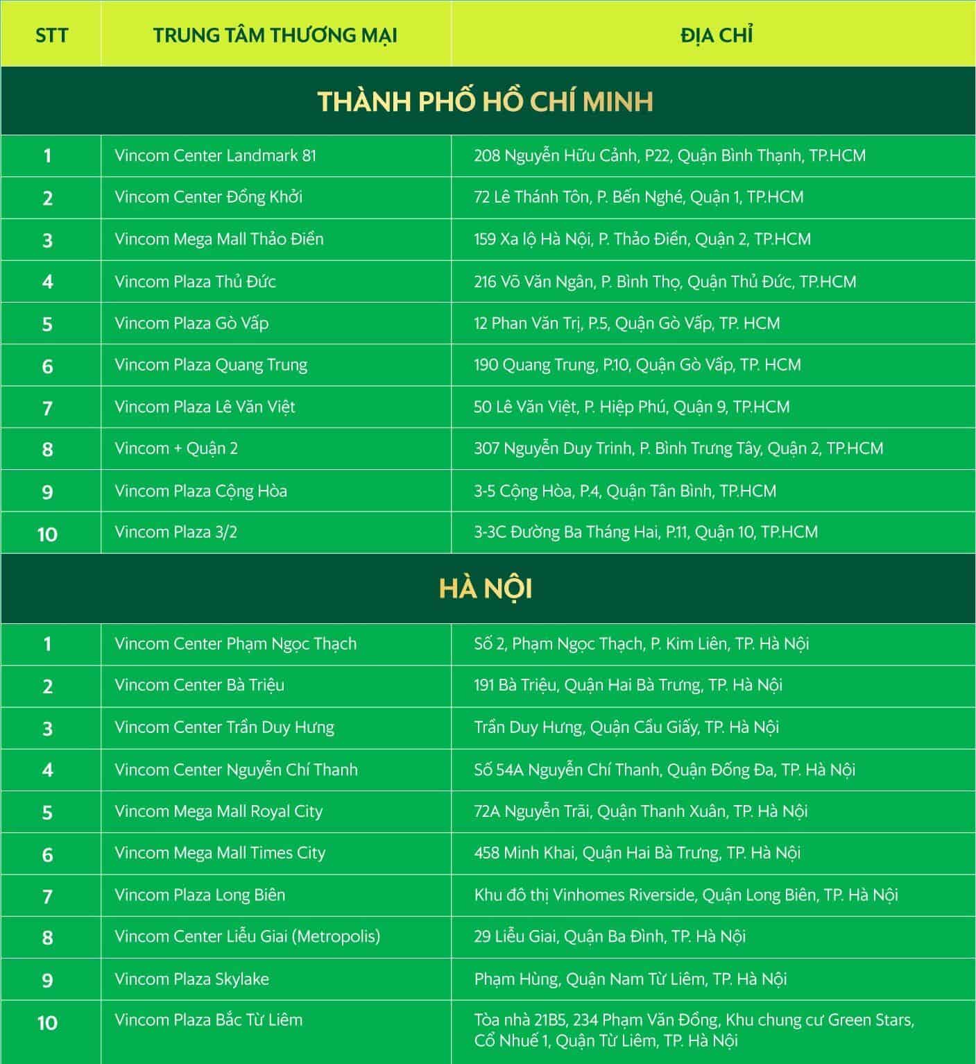 Danh sách các Trung tâm thương mại VINCOM tham gia chương trình: